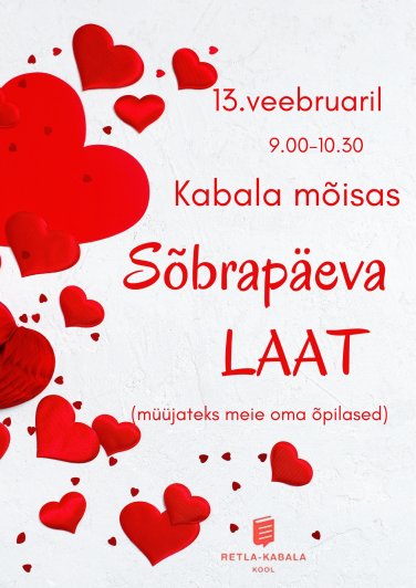 13.veebruar.2026 13 veebr 2026 Sõbrapäeva laat Huvitegevus Õppetöö Aeg 09:00 - 22:00 Asukoht Kabala Rohkem infot Huvitegevus Õppetöö Ava foto