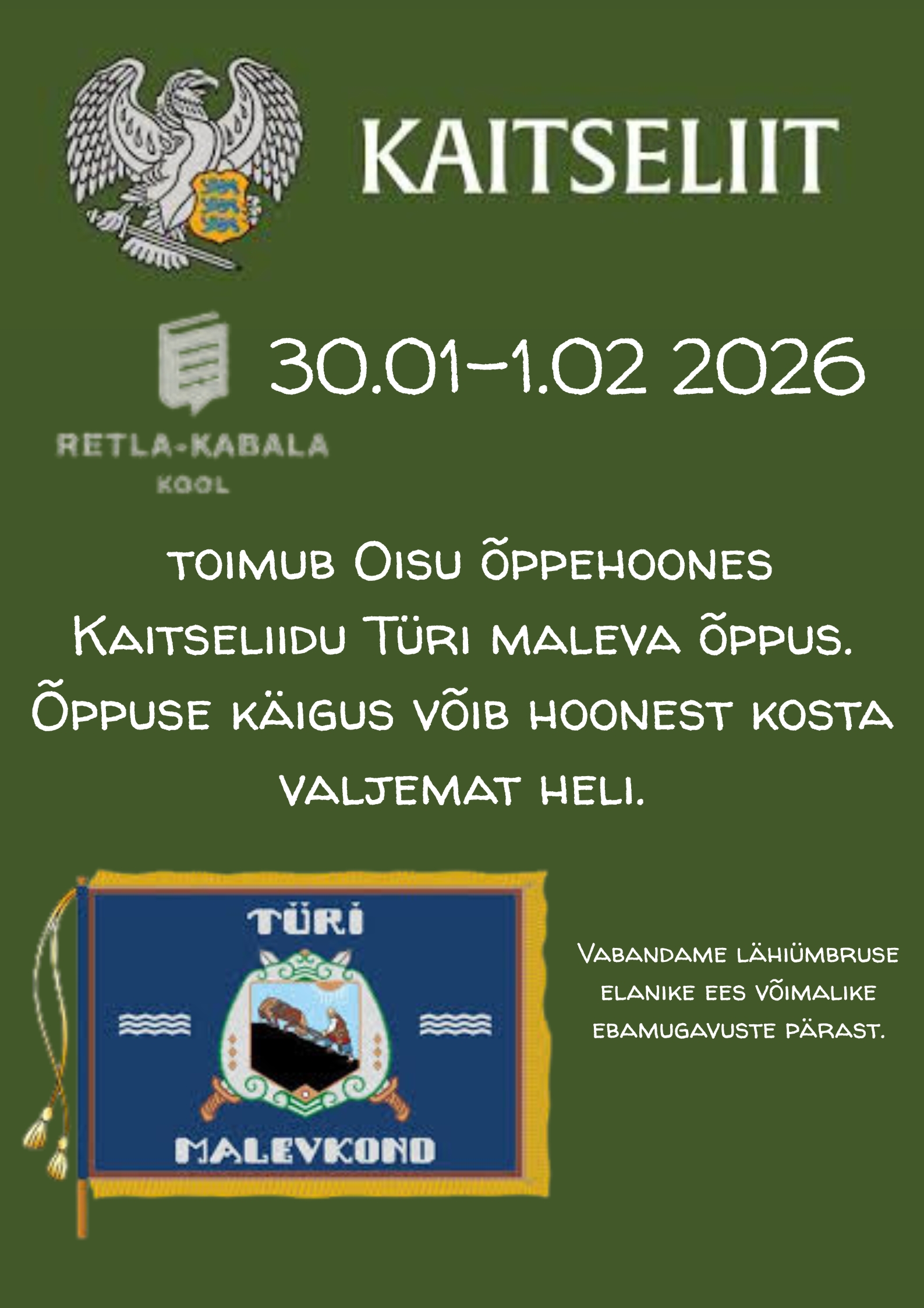 30.01-1.02 toimub Oisu õppehoones Kaitseliidu Türi maleva õppus. Õppuse käigus võib hoonest kosta valjemat heli.